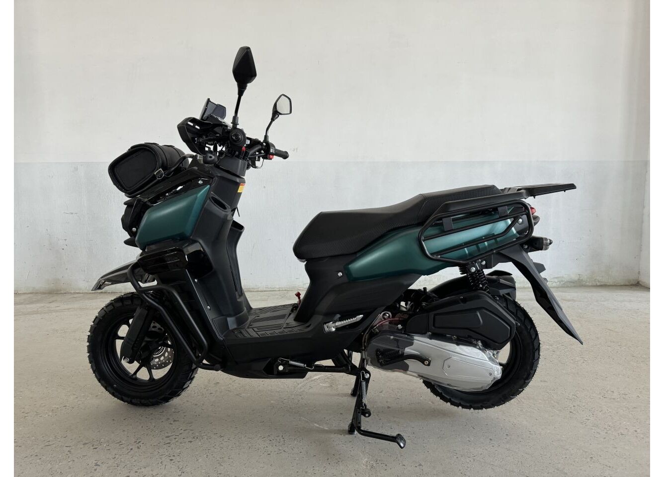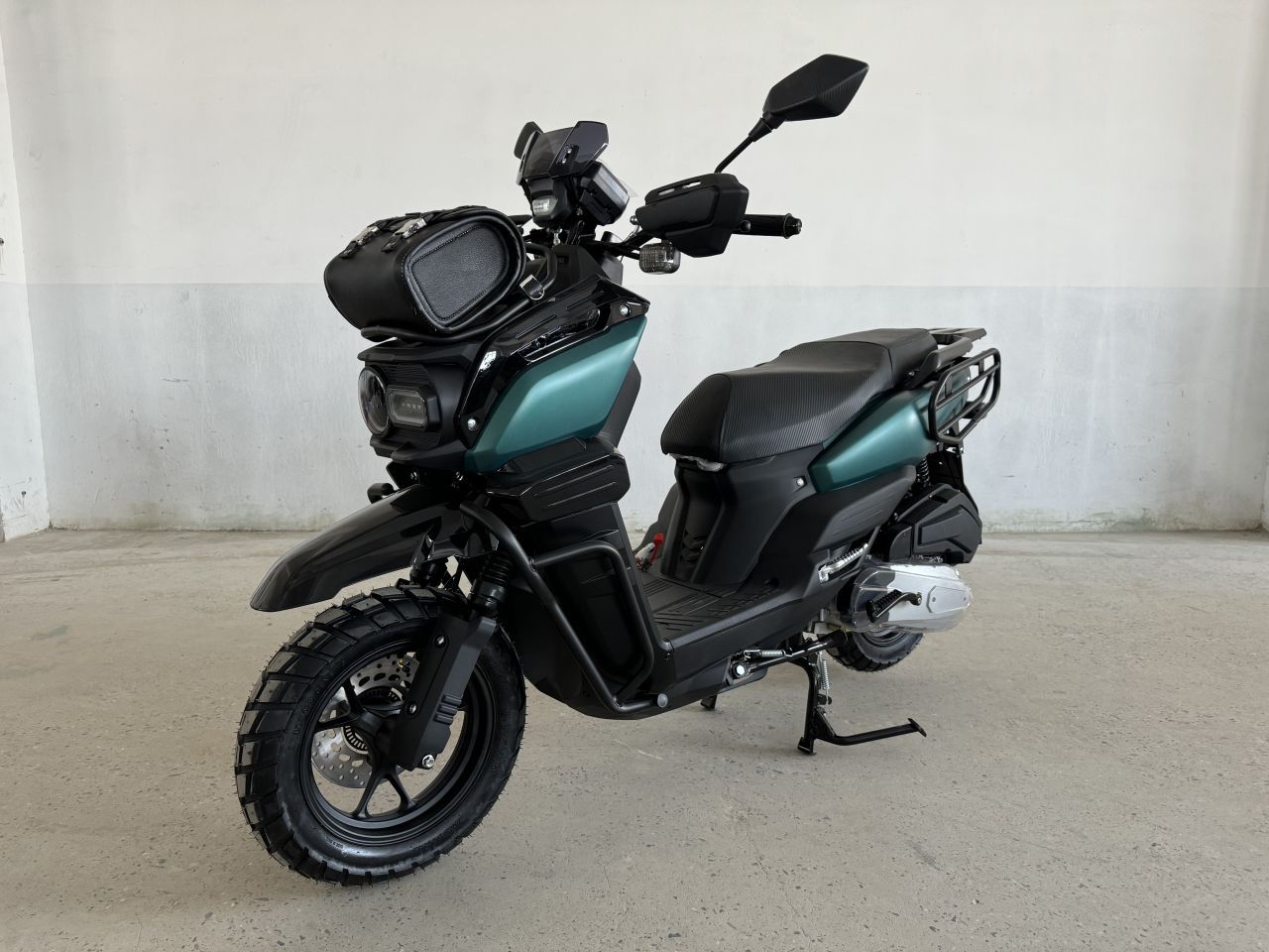 Данный скутер оснащен передним и задним дисковым гидравлическим тормозом, передняя подвеска - это телескопическая вилка, задняя - два амортизатора. Скутер Vector имеет литые диски, светодиодную оптику и ЖК-панель приборов, а также он оснащен красивым защитным обвесом в виде дуг. По своему размеру можно сказать, что этот скутер является "полуторкой", здесь есть подножки пассажира и при необходимости можно увезти на нем второго человека, но в большей части он предназначен для одного человека.